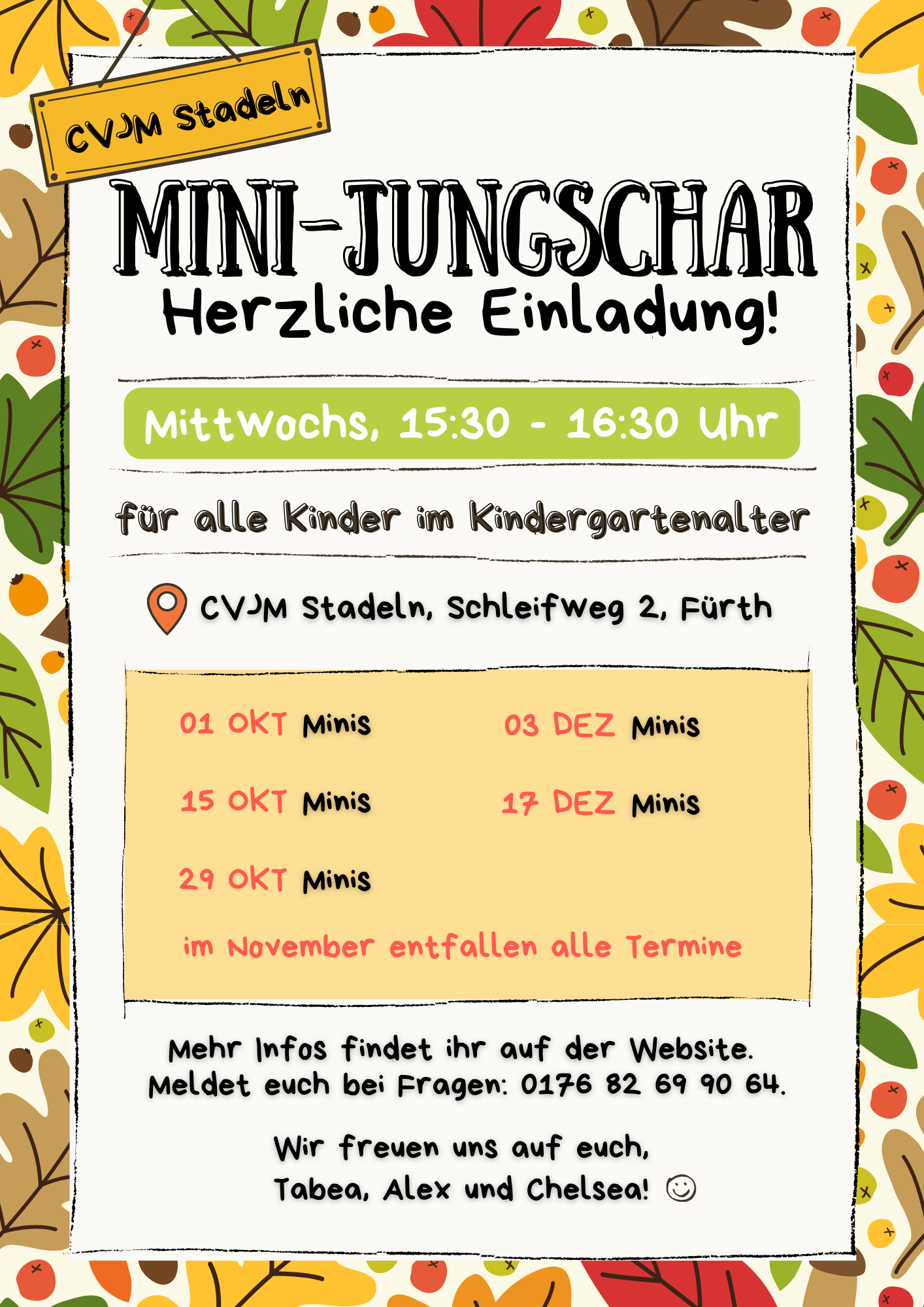 Etwa jeden zweiten Mittwoch (außer in den Ferien) von 15:30-16:30 Uhr treffen sich die „Minis“ im CVJM zur Gruppenstunde. Neues entdecken, Gemeinschaft erleben, von Jesus hören und natürlich ganz viel Spaß stehen dabei im Vordergrund.