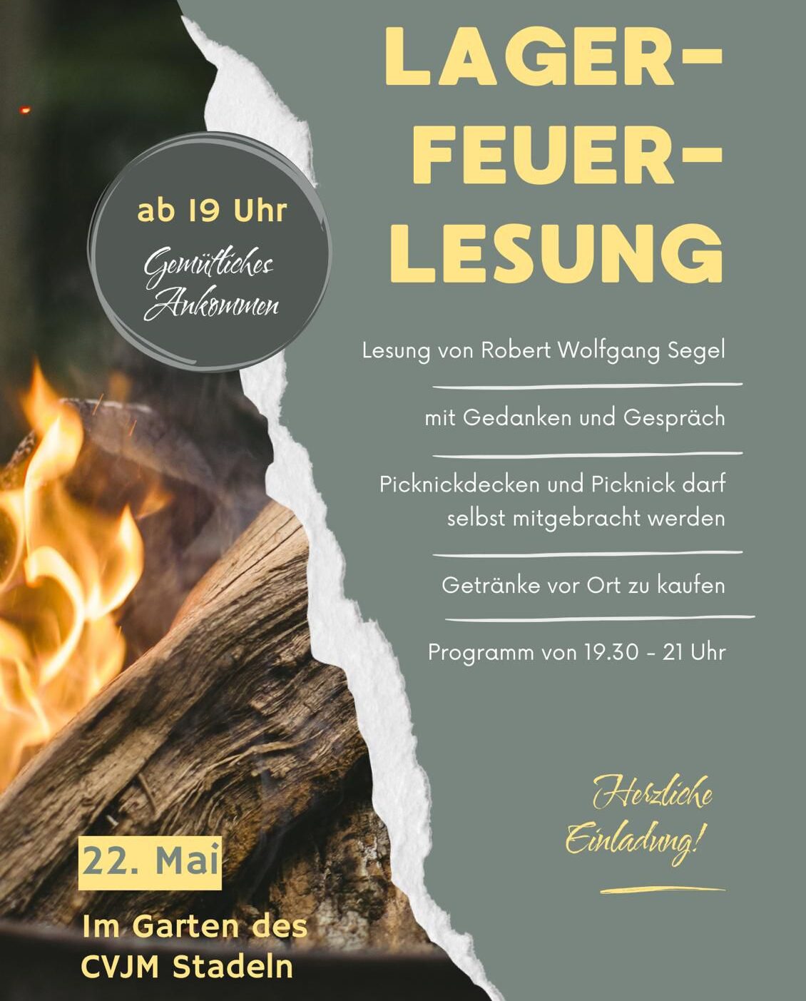 Herzliche Einladung zu diesem abwechslungsreichen Abend. Ab 19 Uhr können es sich die Gäste um das Lagerfeuer gemütlich machen, die Lesung beginnt um 19.30 und endet um 21 Uhr. Dazwischen gibt es Momente zum Nachdenken, eine längere Pause, in der man ins Gespräch kommen oder das Lagerfeuer und Stockbrot genießen kann. Wer möchte, darf sich gerne ein Picknick und eine Decke mitbringen. Getränke können vor Ort gekauft werden. Bei schlechtem Wetter findet die Lesung innen statt.